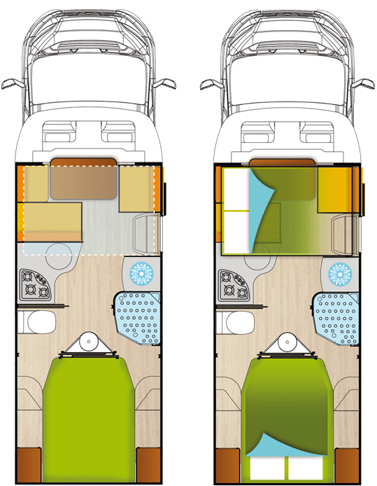 Grundriss bestimmendes Merkmal bei dem T 738 QB ist das 140 x 195 cm große, bequeme Zentralbett im Heck. Mit einer mechanischen Höhenverstellung können die Reisenden die Bettenhöhe bzw. das Garagenvolumen je nach Bedarf stufenlos variieren. Zwei Kleiderschränke im Heck nehmen auch lange Jacken und Mäntel mit auf die Reise. Vor dem Zentralbett ist ein Raumbad installiert, das von dem mittig vor dem Bett positionierten Waschbecken, der separaten Dusche und dem Toilettenraum eine große Bewegungsfreiheit bietet. Zwei Schiebetüren zum Schlafzimmer und eine weitere zum Vorderwagen wahren zum einen die Privatsphäre, ermöglichen aber andererseits auch dir Umwandlung der Waschraumfläche in ein großes Ankleidezimmer direkt am Bett. Den Vorderwagen bestimmt eine komfortable L-Sitzgruppe inklusive Seitensitzbank für bis zu 5 Personen. Im Einstiegsbereich findet sich eine Winkelküche mit 160 Liter großem Kühlschrank, die ebenfalls viel Bewegungsfreiheit bietet.