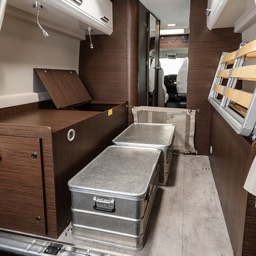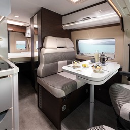 Lifestyle - Paket (LED Ambiente - Beleuchtung an Oberschränken, Dinette und Küche, Staufach über Fahrerhaus mit Klappe, zusätzlicher Oberschrank über Hecktüren, Küchenablage aus Mineralstoff, Logo - Blende in Metall - Optik am Küchenblock, seitlicher Auszug am Küchenblock, Stauraum im Fußbereich)