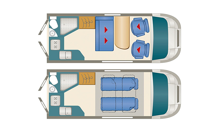 In der übrigen Zeit haben Sie mehr Stauraum oder Freiraum – ganz, wie Sie möchten. Und so sind unsere Dexter auch sonst ausgestattet: wunschgemäß. Keine Wünsche offen lässt dabei schon der kompakte Dexter 550, der mit natürlich schönem Mobiliar in Holzoptik überrascht und unfassbar viel Raumkomfort bietet. Ist er innen größer als außen? Wenn man die großzügige Vierer-Sitzgruppe mit Klappsofa, die große Winkelküche und das Komfortbad so sieht, könnte man es fast glauben. Zumal auch die sonstige Ausstattung sehr umfangreich ist. Der Dexter 550 ist eben ein kleines Raumwunder und das liegt vor allem an dem absenkbaren Hubbett, das Ihren Dexter quasi zweistöckig macht. Und so kann man sich oben schon entspannen, während in der bequemen Sitzgruppe darunter noch eifrig in einem Buch geschmökert wird. Oder vielleicht doch in einem Reiseatlas?